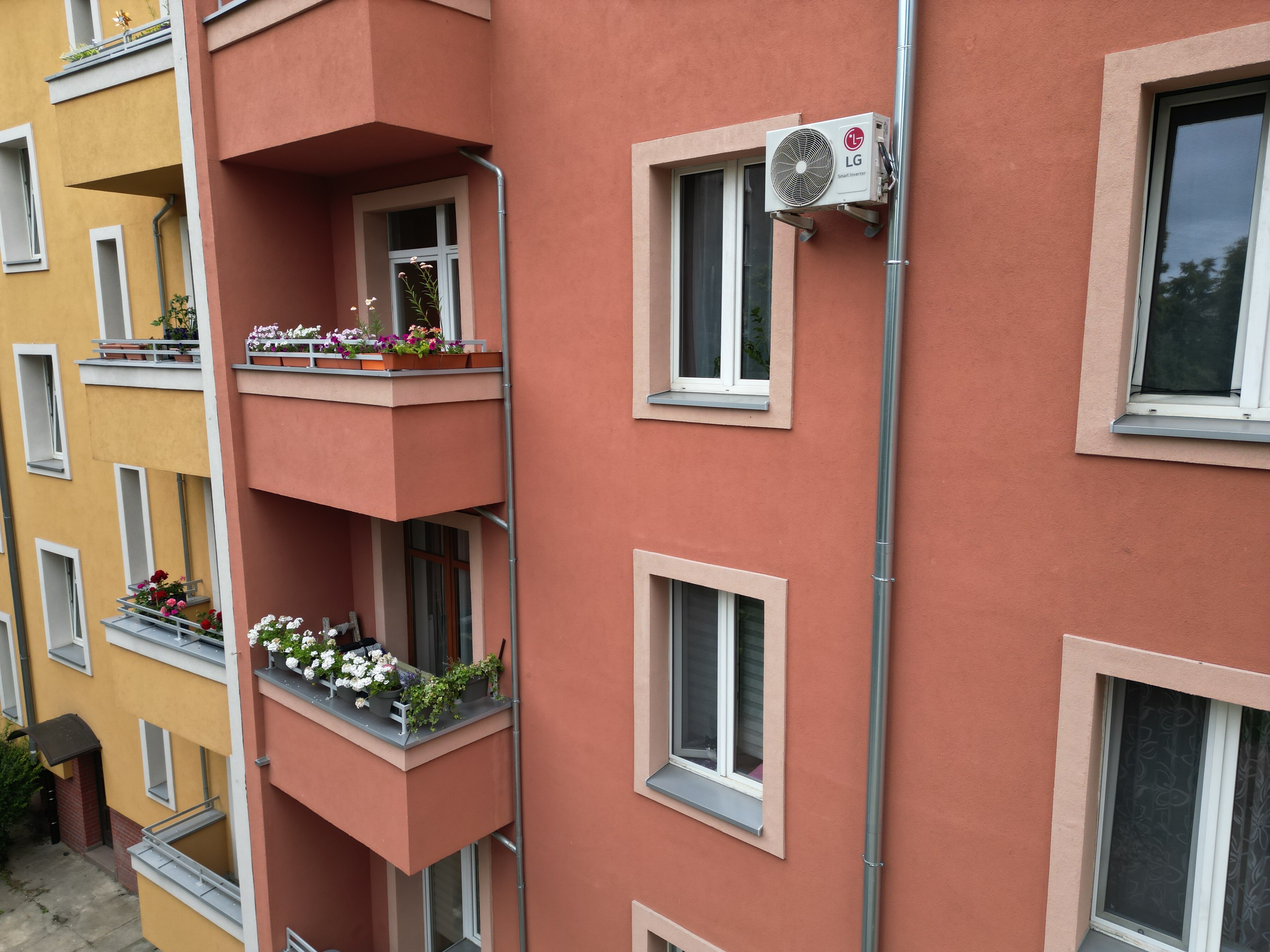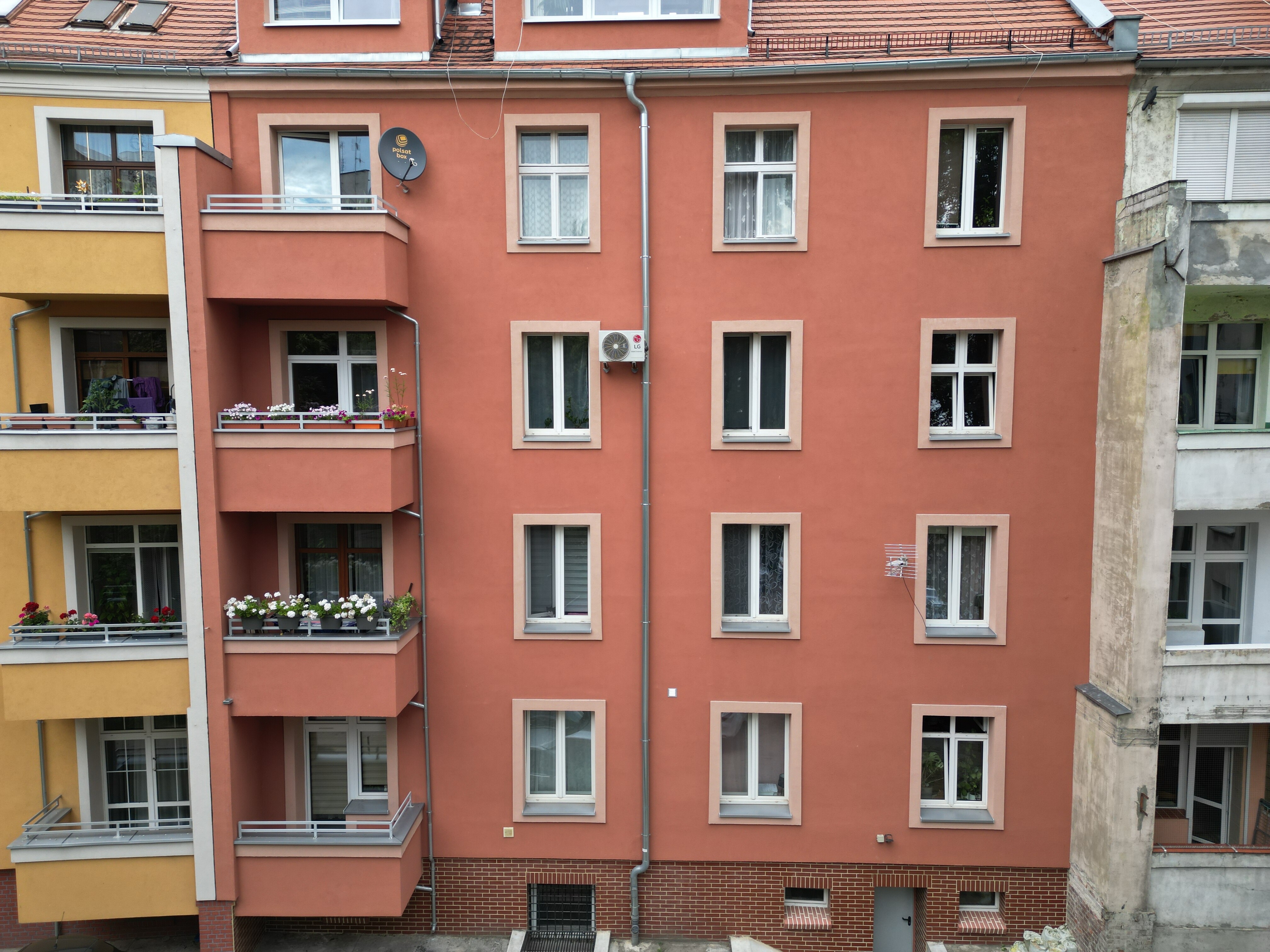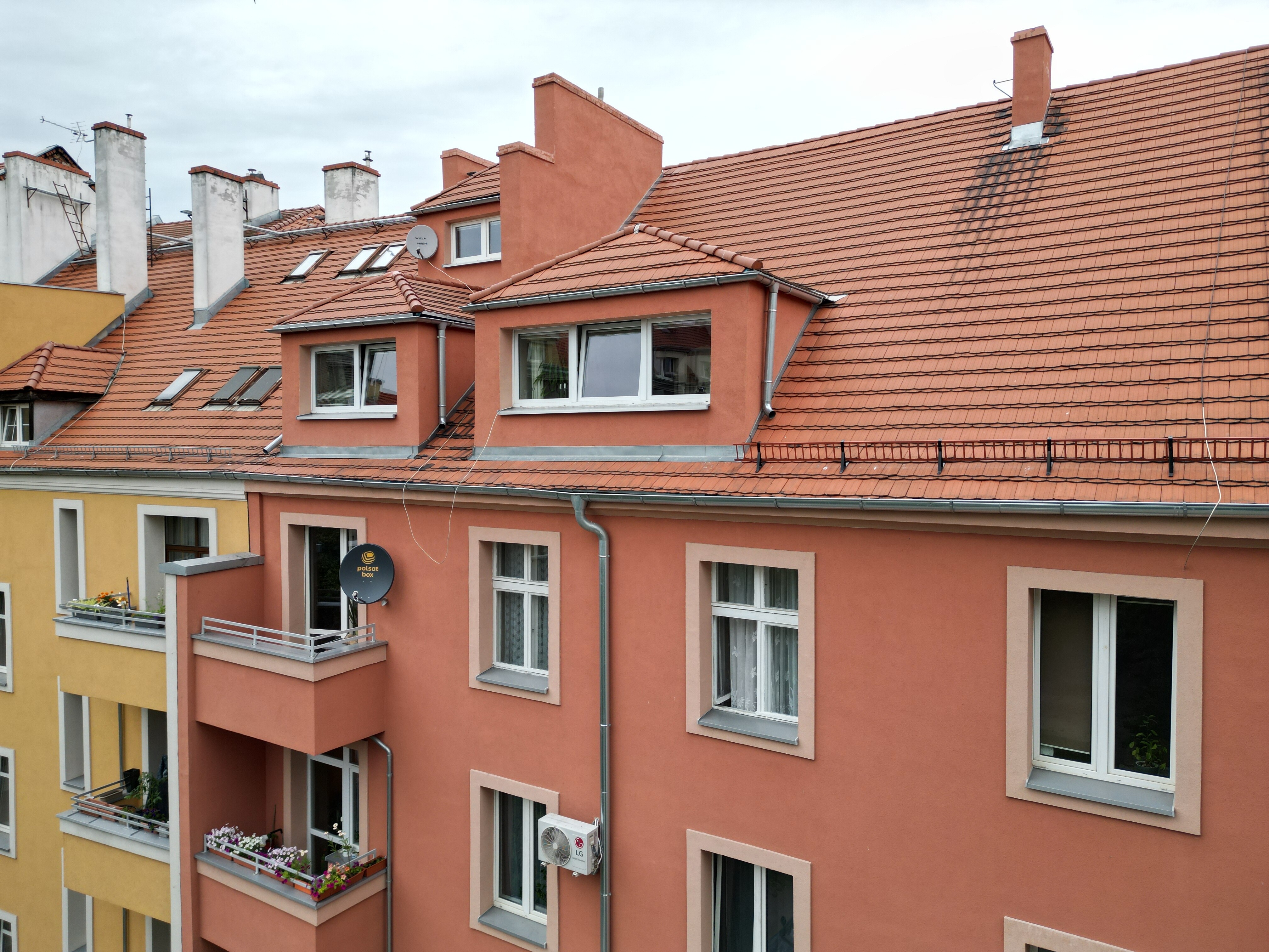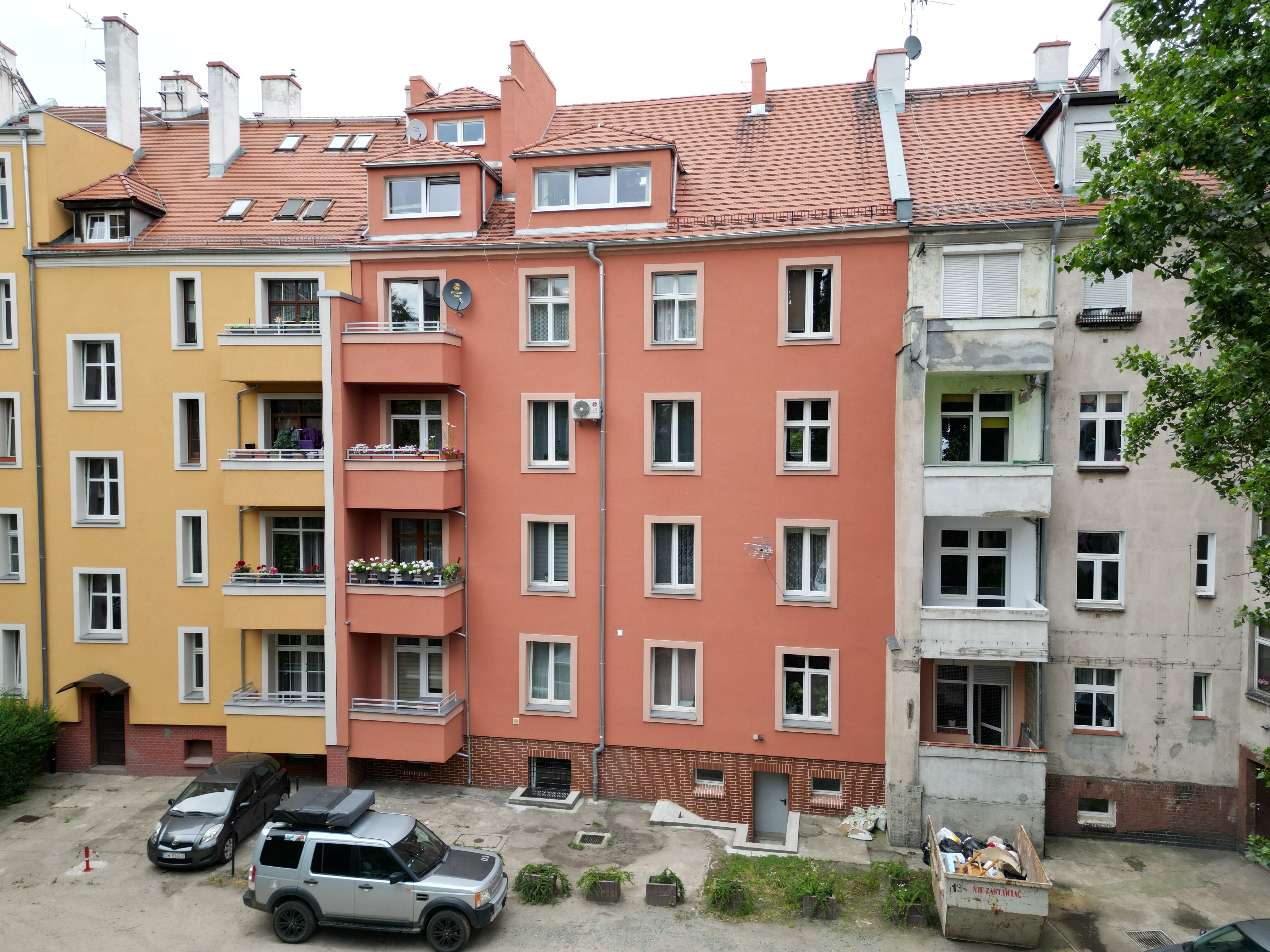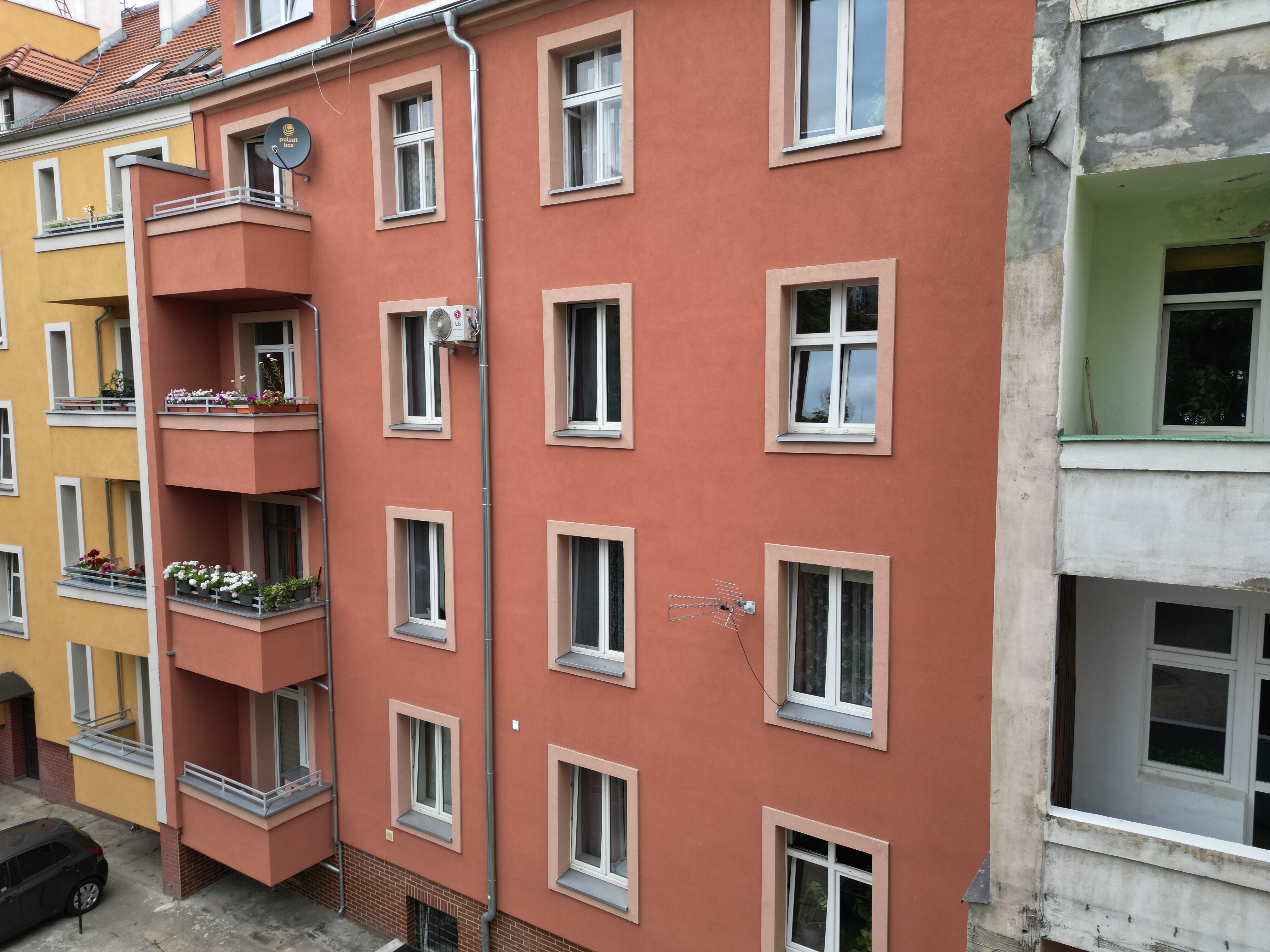 W ramach przeprowadzonych prac budowlano-remontowych wykonano termoizolację elewacji podwórzowej, obejmującą przygotowanie podłoża, montaż warstw ocieplenia oraz wykonanie nowej wyprawy tynkarskiej. Zastosowane materiały poprawiły efektywność energetyczną budynku i zabezpieczyły elewację przed czynnikami atmosferycznymi. Równolegle przeprowadzono remont balkonów, obejmujący wymianę obróbek blacharskich oraz odnowienie balustrad, co przywróciło estetykę strefy balkonowej.