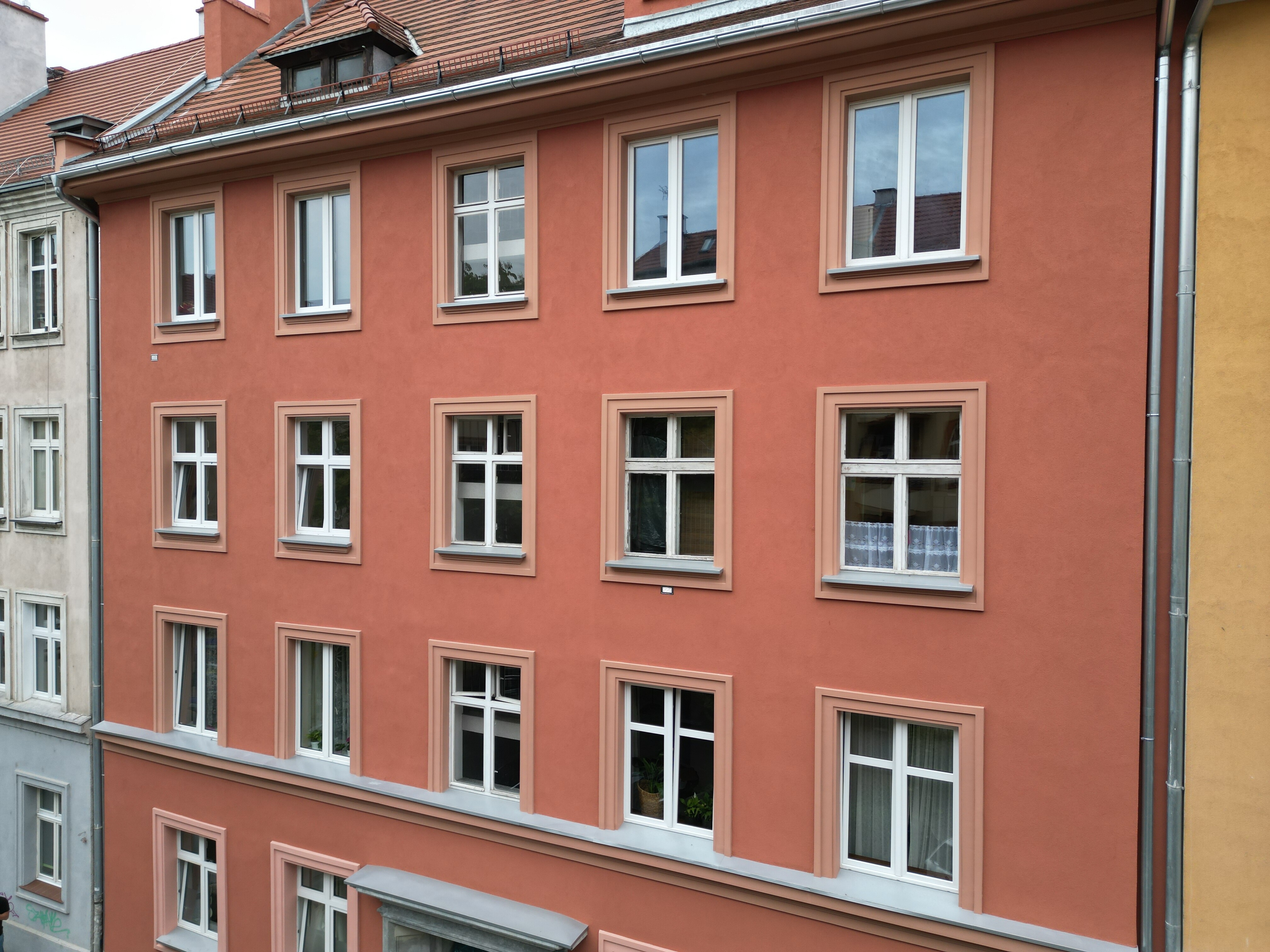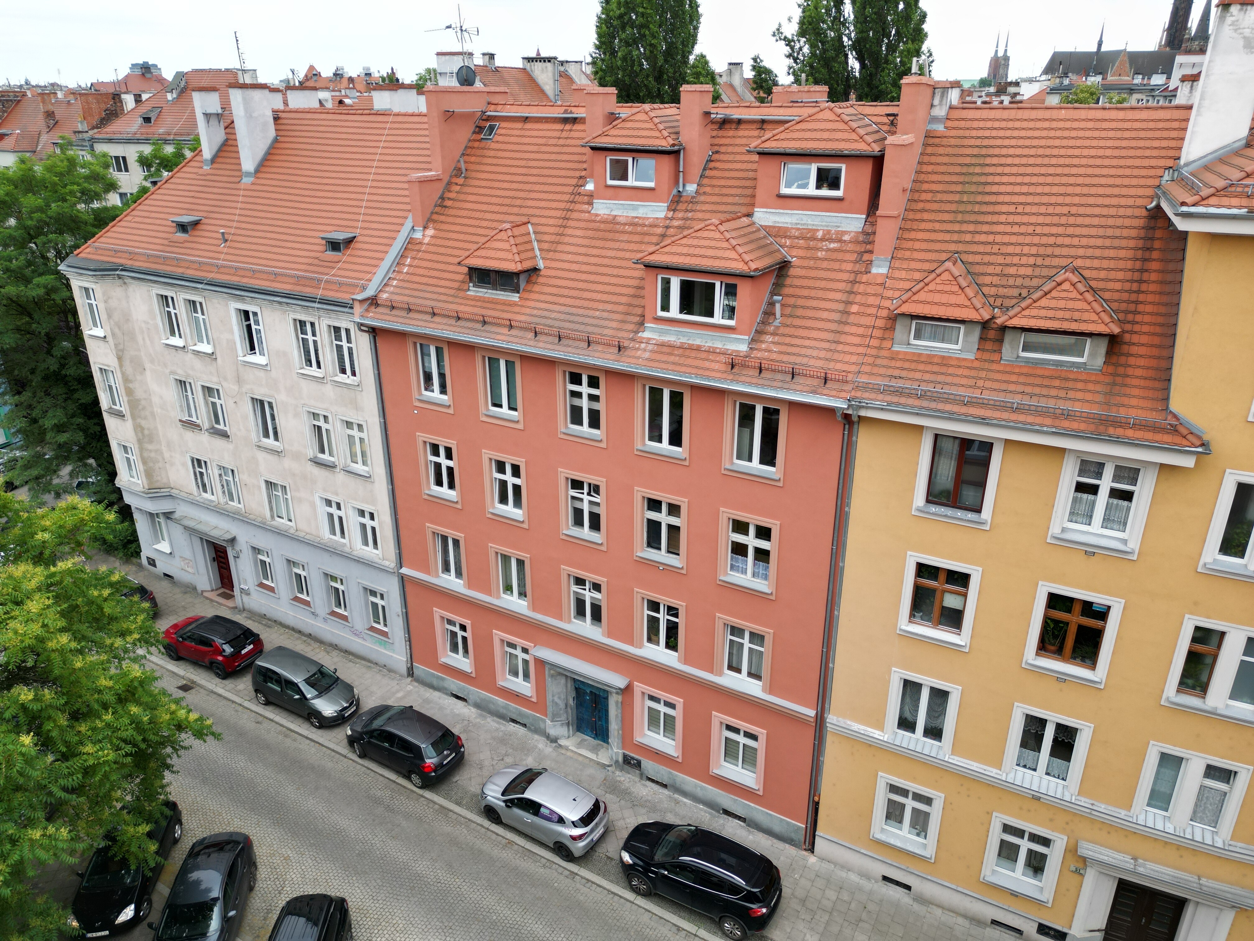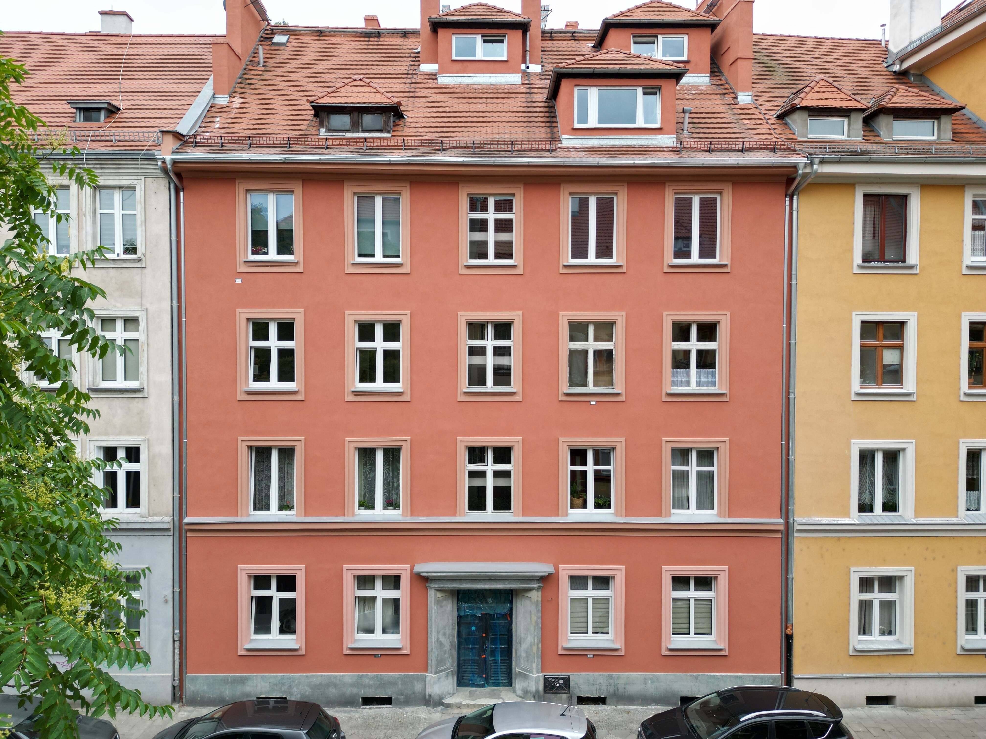 Na elewacji frontowej nałożono nową strukturę tynkarską, która odświeżyła wygląd fasady oraz uwydatniła detale architektoniczne kamienicy. Sztukatorzy odtworzyli oryginalny wygląd cokołu oraz portalu wykonanego z piaskowca, przywracając im historyczną formę i właściwe proporcje zgodne z pierwotnym projektem. W ramach prac stolarskich zamontowano również nowe drzwi wejściowe, a strefę wejściową uzupełniono o nowy stopień z granitu, charakteryzujący się wysoką trwałością i odpornością na ścieranie.