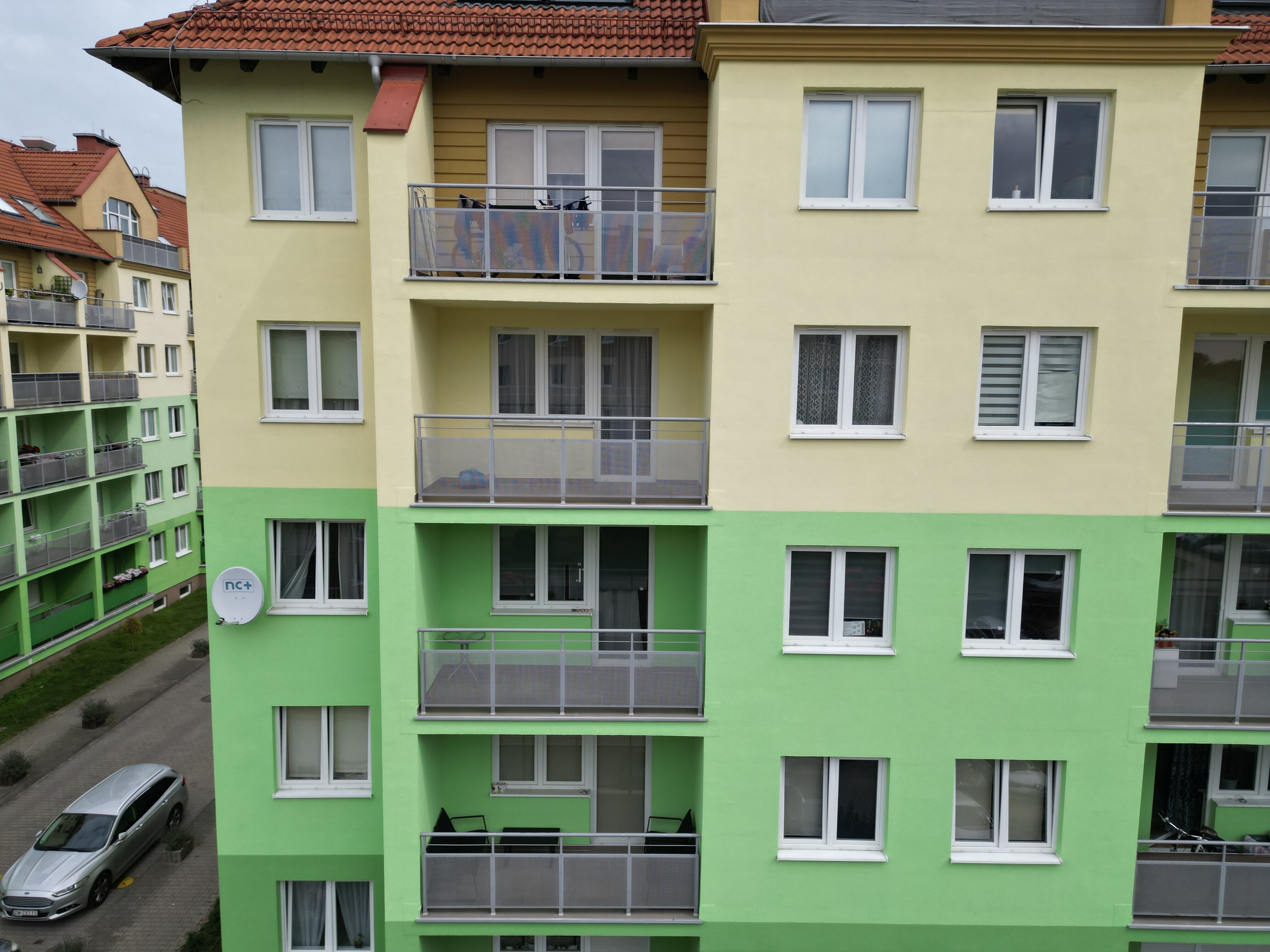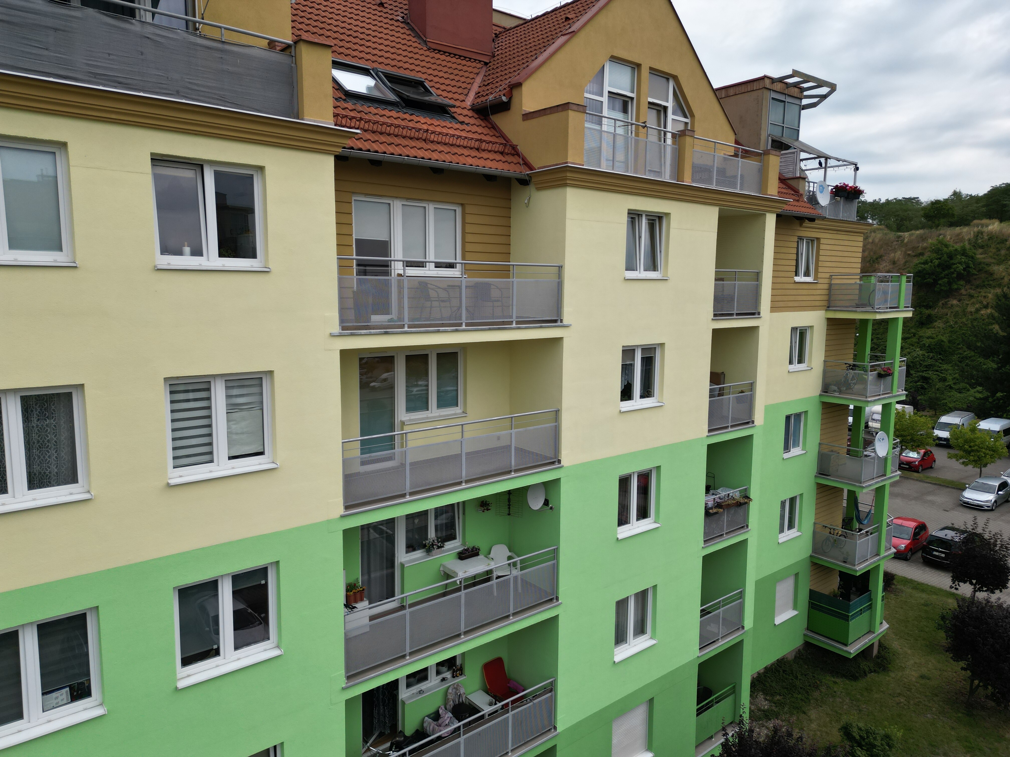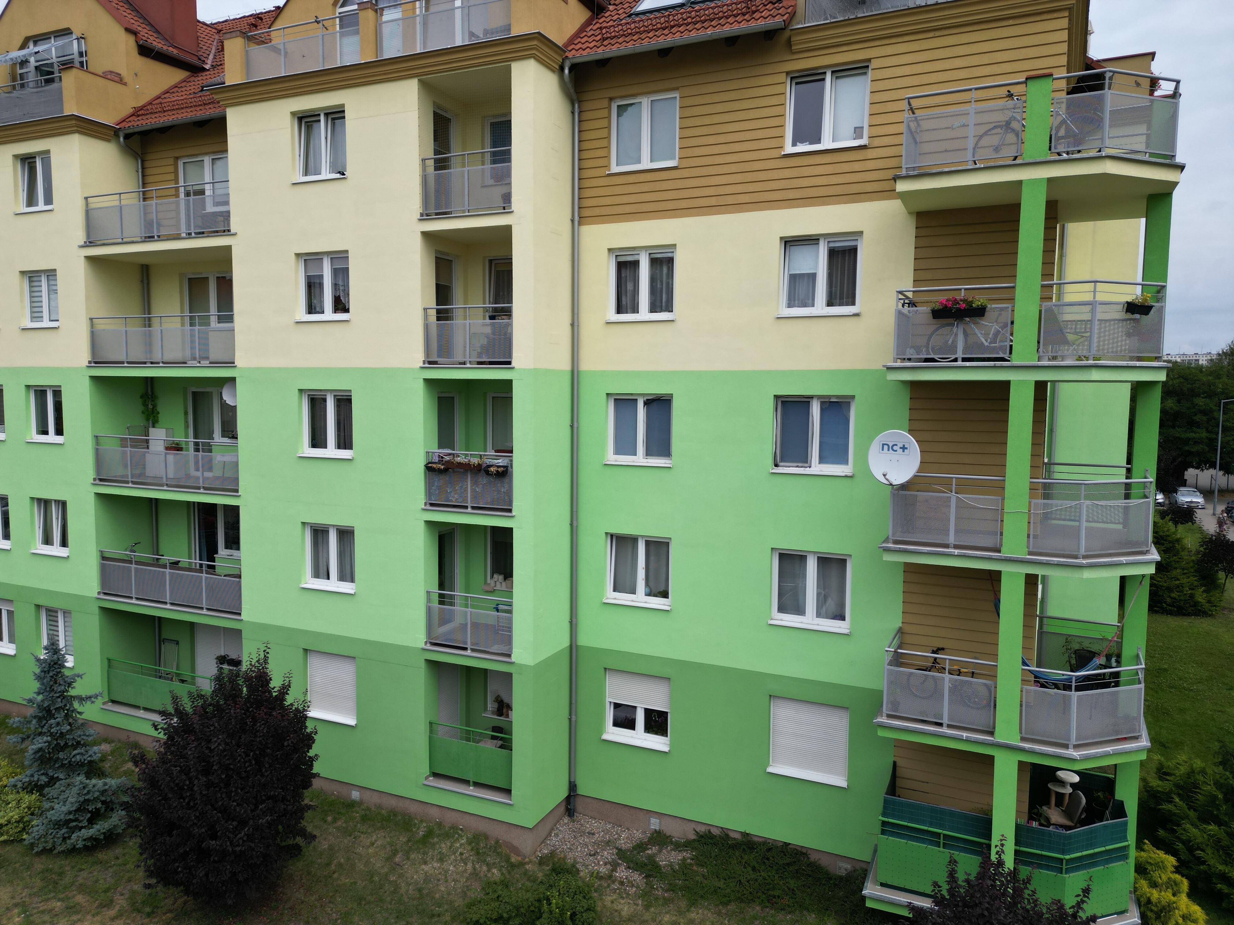Równolegle przeprowadzono kompleksowy remont balkonów. Roboty objęły wykonanie nowych hydroizolacji, wymianę okładzin podłogowych oraz odświeżenie balustrad, które oczyszczono, zabezpieczono antykorozyjnie i pomalowano. Dodatkowo uzupełniono obróbki blacharskie oraz naprawiono elementy konstrukcyjne, co przywróciło pełną funkcjonalność i bezpieczeństwo użytkowania balkonów.